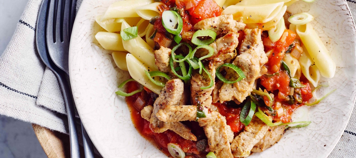 4. Faites brièvement revenir les émincés de porc à feu vif, salez, poivrez et ajoutez la moitié des oignons nouveaux. Mélangez la viande à la sauce et servez-la avec les pâtes, garnissez le plat avec le reste des oignons nouveaux et servez immédiatement.