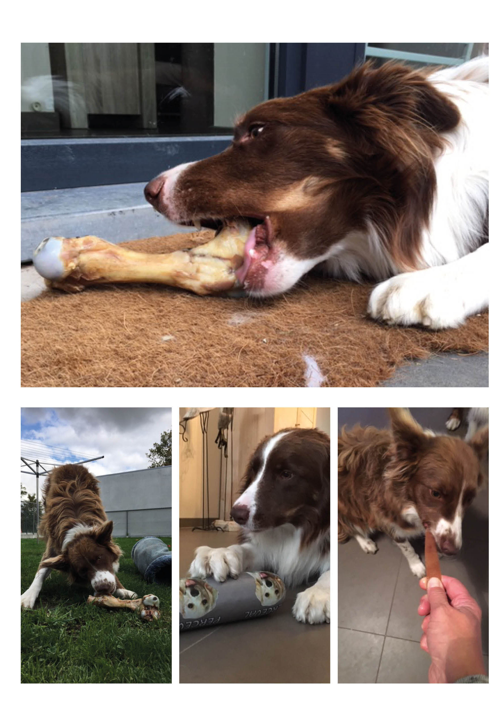 Dolenthousiast! Ik had voor hen een pakketje samengesteld met grote en kleine hondenbenen, hondenworsten, zwoerdreepjes – en blokjes. Vooral de geur van de grote hondenbenen deed hen watertanden, daar stormden ze meteen op af. Zelfs onze kat begon te likkebaarden, ik moest ze tegenhouden om niet mee te smullen met Mylo en Wencke. De hondenworst is ook een goede aanvulling op hun dagelijkse, evenwichtige voeding. Geplette worst met wat brood in hun hondenbrokken vinden ze overheerlijk. De zwoerdreepjes – en blokjes zijn dan weer de perfecte snoepjes, de ultieme beloning als ze braaf geweest zijn.