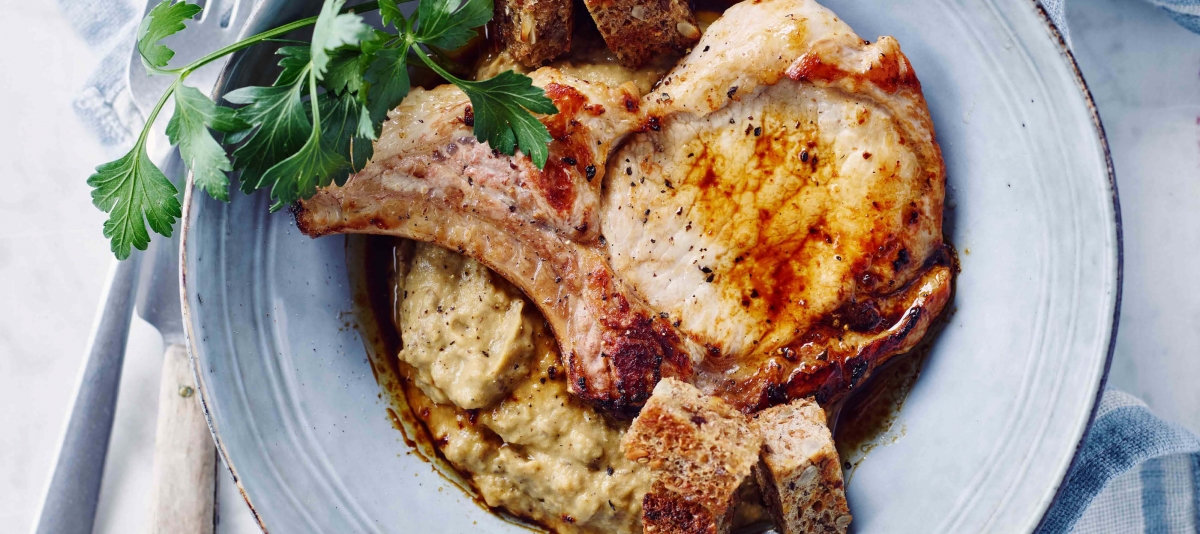 4. Verdeel de erwtenpuree over de borden, leg er een kotelet op en werk af met braadjus en de croutons.